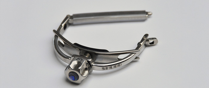 This is a radical redesign for Shubb, whose reputation was built over the past 35 years on a snap-action style capo that could be quickly deployed into action. These original Shubb models introduced a soft rubber padding on the bar that very closely mimicked the density of human flesh, with a tension adjusting screw on the bottom lip.